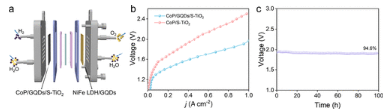 Fig 6. (a) 實驗室規(guī)模 AEM 電解槽的示意圖。 (b) 使用 CoP/GQDs/S–TiO