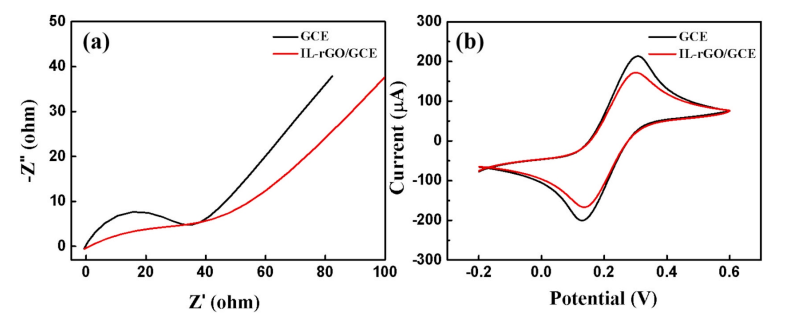 Fig 3. (a) 離子液體還原氧化石墨烯修飾玻碳電極(IL - rGO/GCE)的電化學(xué)阻抗譜(EIS)曲線 ;(b) 離子液體還原氧化石墨烯修飾玻碳電極(IL - rGO/GCE)的循環(huán)伏安法(CV)曲線。