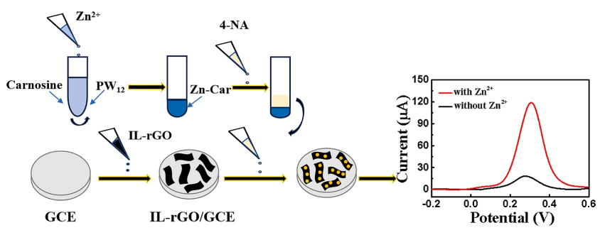 天然水中的各種金屬離子會對人體構(gòu)成顯著的毒性風(fēng)險,鋅離子(Zn²?)便是其中之一。盡管相較于其他金屬,Zn²?的毒性相對較低,但監(jiān)測其濃度以防范潛在健康危害仍至關(guān)重要。然而,由于Zn²?無色且具有較高的還原電位,尤其是在低濃度情況下,要實現(xiàn)對其高選擇性的檢測頗具挑戰(zhàn)。在本研究中,基于鋅 - 肽組裝體的酯酶樣活性,構(gòu)建了一種用于特異性檢測Zn²?的電化學(xué)傳感平臺。其檢測機(jī)制為:在磷鎢酸鈉(PW??)的促進(jìn)下,Zn²?與L - 肌肽(Car)發(fā)生反應(yīng),生成沉淀物,該沉淀物可將4 - 硝基苯乙酸(4 - NA)催化轉(zhuǎn)化為4 - 硝基苯酚(4 - NP)。采用離子液體還原氧化石墨烯(IL - rGO)修飾的玻碳電極作為電化學(xué)傳感平臺。IL - rGO修飾增強(qiáng)了電極對4 - NP的吸附能力,并增大了其電化學(xué)活性表面積,從而提升了傳感器性能。此方法對Zn²?檢測展現(xiàn)出優(yōu)異的選擇性,檢測限低至0.087 nM。此外,該傳感器還表現(xiàn)出良好的穩(wěn)定性和可靠性。本研究以Zn²?為例,展示了一種基于離子獨特性質(zhì)開發(fā)的特異性電化學(xué)傳感器。這種開發(fā)策略對于在配位環(huán)境中對所有具有催化活性的離子進(jìn)行高特異性檢測具有潛在價值,為未來高特異性離子傳感器的開發(fā)提供了有價值的指導(dǎo)。