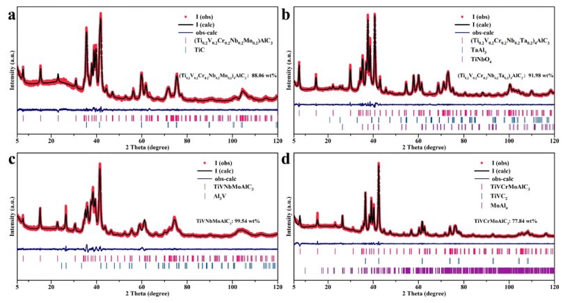 Fig 2. 合成樣品的X射線衍射(XRD)里特沃爾德精修分析。(a) (Ti?.?V?.?Cr?.?Nb?.?Mo?.?)?AlC? ;(b) (Ti?.?V?.?Cr?.?Nb?.?Ta?.?)?AlC? ;(c) TiVNbMoAlC? ;(d) TiVCrMoAlC? 。