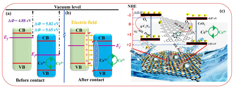 圖9。CeO2和g-C3N4在接觸前(a)和接觸后(b)的電荷轉(zhuǎn)移示意圖,以及可見光照射下CeO2@N-GO/g-C3N4的光催化機制(c)的提出。