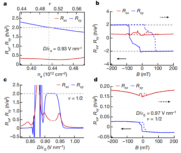 c,固定v=1/2時,Rxy和Rxx隨位移場D的變化曲線。在D=0.9–0.94伏特/納米范圍內(nèi),Rxy保持量子化平臺;當D更高時,Rxy和Rxx均趨近于零;當D更低時,Rxx急劇上升,Rxy則圍繞零值劇烈波動。