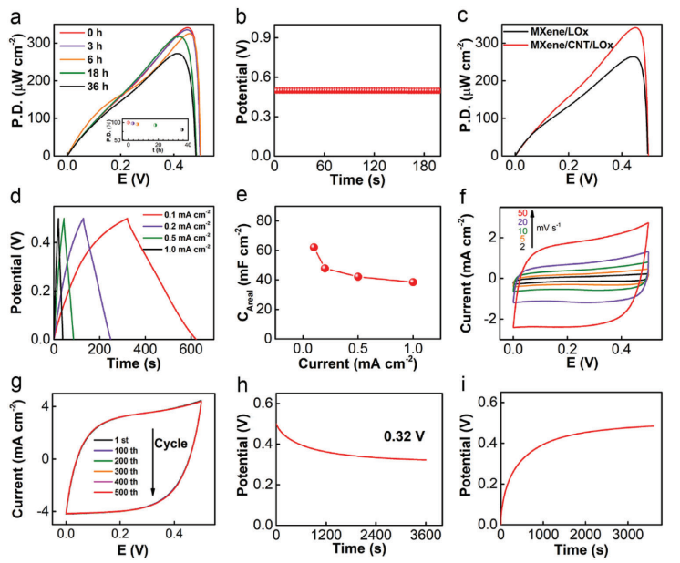 c) 分別采用MXene/LOx和MXene/CNT/LOx作為生物陽極時的功率密度-電壓曲線對比;