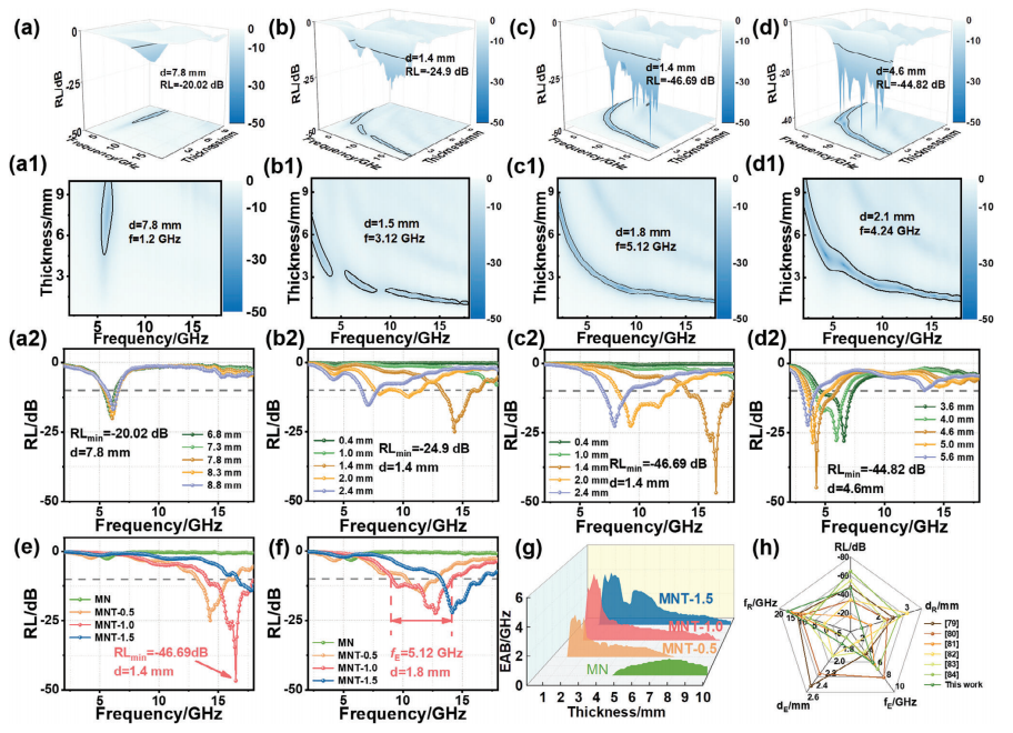 MNT-1.0(c–c2)的3D多孔結(jié)構(gòu)(孔徑~200 nm)與界面梯度設(shè)計顯著提升電磁波多重散射,其最小反射損耗(RL<sub>min</sub>)達(dá)-58.4