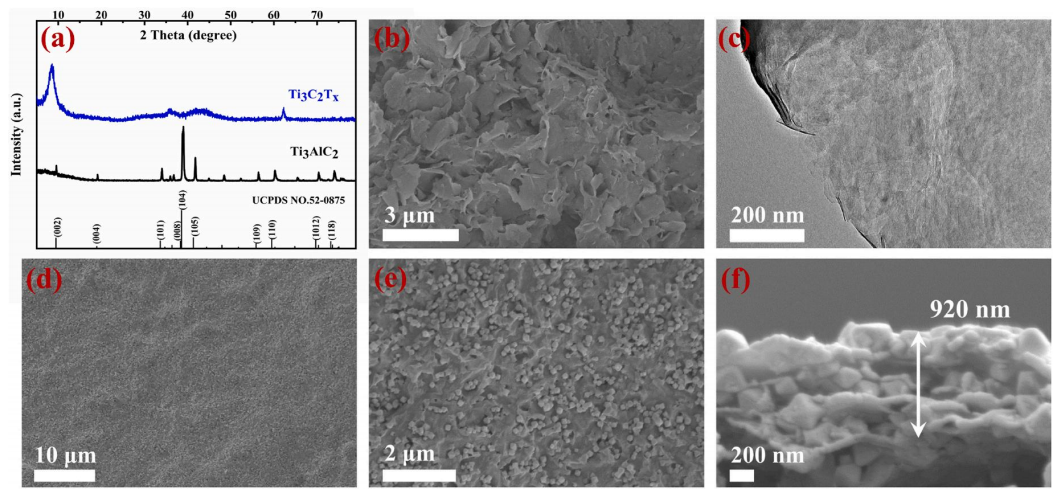 形貌表征(圖2b-c):超聲剝離后的MXene納米片呈透明褶皺狀,F(xiàn)E-SEM顯示橫向尺寸約3-5μm,TEM證實(shí)其單層/少層特性及表面官能團(tuán)(-OH、-F)分布。
