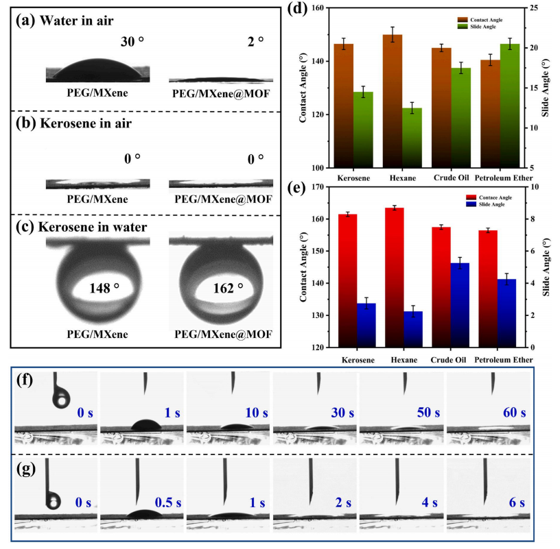 (a) 水和煤油滴在空氣中的潤濕性對PEG/MXene和PEG/MXene@MOF膜的影響: