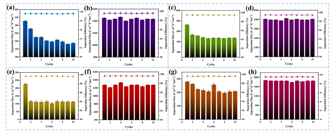 圖8.PEG/MXene膜在分離(a)K/W,(c)H/W,(e)C/W和(g)PE/W乳液中的循環(huán)穩(wěn)定性。PEG/MXene@MOF膜在分離(b)K/W,(d)H/W,(f)C/W和(h)PE/W乳液中的循環(huán)穩(wěn)定性。