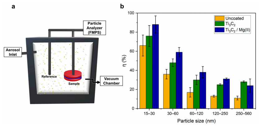 圖4.(a) 過濾測試裝置的示意圖,樣品被夾在真空室內(nèi)的兩個(gè)紅色夾具之間(底部)。然后,將其充滿從氣溶膠入口(左側(cè))進(jìn)入的NaCl顆粒氣溶膠,并通過顆粒分析儀(FMPS,右側(cè))收集數(shù)據(jù)。(b) 未涂層紡織品以及Ti3C2和Ti3C2/Mg(II)涂層紡織品在5.6 nm至560 nm顆粒范圍內(nèi)的NaCl氣溶膠過濾效率(η)。