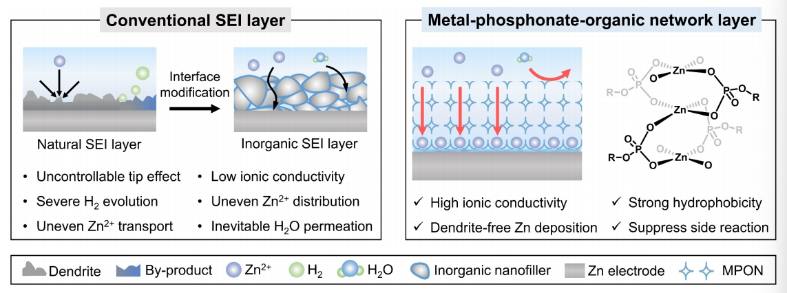 Scheme 1. 不同界面層的結(jié)構(gòu)及鋅沉積行為示意圖。左:采用常規(guī)固體電解質(zhì)界面(SEI)層保護(hù)的鋅金屬電極中的鋅沉積行為,包括自然SEI層和無(wú)機(jī)納米填料層。右:金屬-膦酸酯-有機(jī)網(wǎng)絡(luò)(MPON)層優(yōu)化的離子傳輸行為及其對(duì)應(yīng)的Zn位點(diǎn)局部配位環(huán)境。
