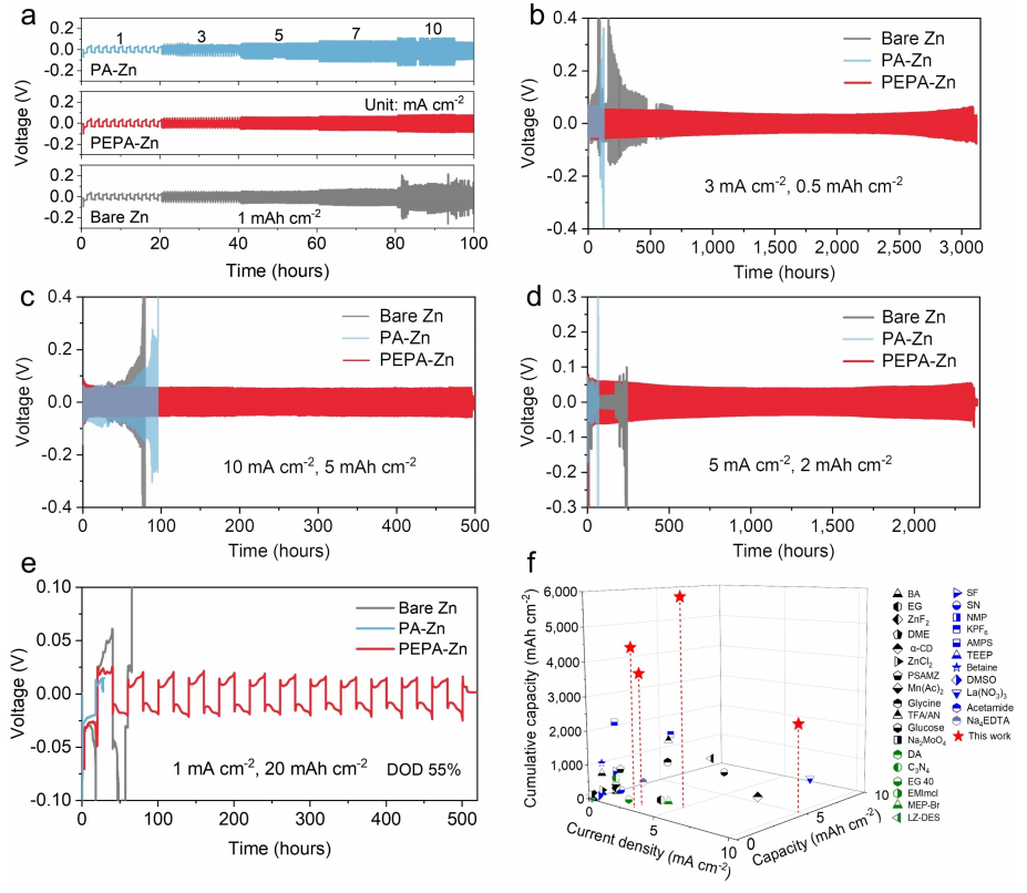 (f) PEPA電解質(zhì)中對(duì)稱電池的累積容量、電流密度和鋅電鍍/剝離容量與之前報(bào)道的通過(guò)不同添加劑穩(wěn)定的優(yōu)秀鋅金屬電極的比較。