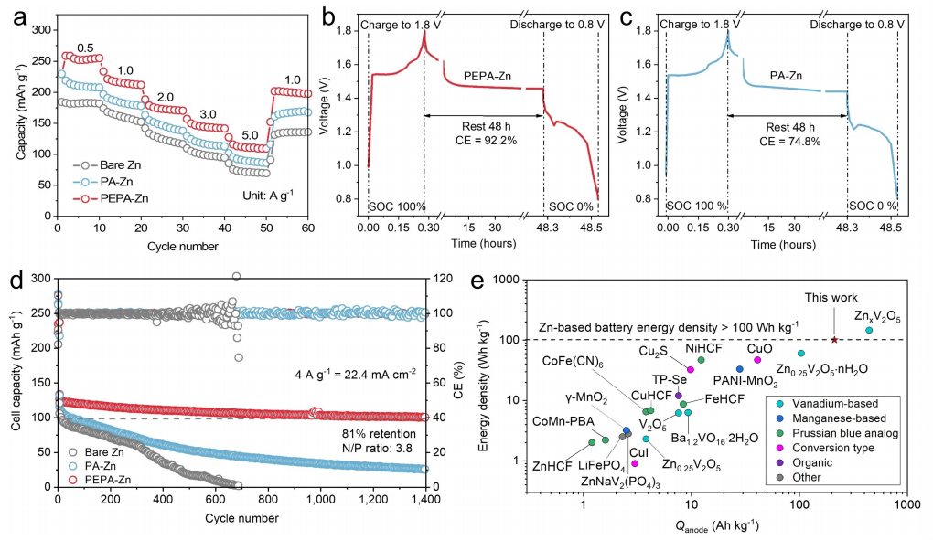 (e) 比較了本文中達(dá)到的能量密度與以往報(bào)道的鋅離子電池的能量密度。具體能量值是根據(jù)陰極和陽(yáng)極的比容量以及電池的平均放電電壓計(jì)算得出的。Qnode表示鋅陽(yáng)極的利用率。目標(biāo)值>100 Wh kg?¹由水平虛線表示。