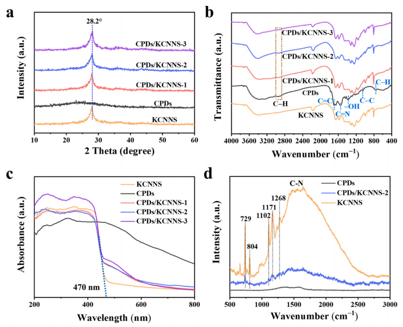 | 界面能帶 | 形成Ⅱ型異質(zhì)結(jié):KCNNs的CB(-1.2 eV)→ CPDs的LUMO(-0.9 eV),ΔE=0.3 eV26 | 光生電子(e?)定向遷移至CPDs,空穴(h?)滯留KCNNs,抑制復(fù)合25 |