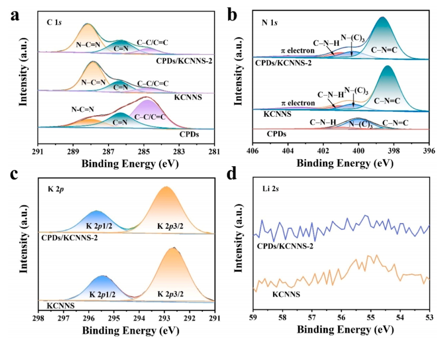 | (e)(f) | CPDs/KCNNs界面原子堆疊 | 界面功函數(shù)顯著降低(如≈4.0 eV) | 異質(zhì)結(jié)內(nèi)建電場(chǎng)形成:電子從KCNNs→CPDs自發(fā)轉(zhuǎn)移1011 |