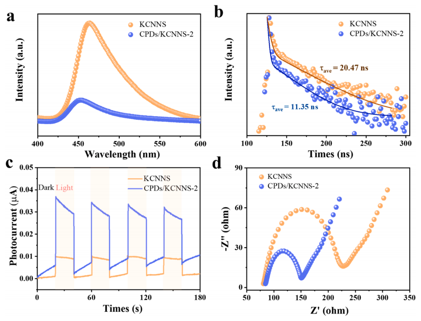 | 光生電荷分離 | KCNNs受光激發(fā)產(chǎn)生e?-h?對(duì) | 電荷分離效率提升約70%(對(duì)比純KCNNs) |