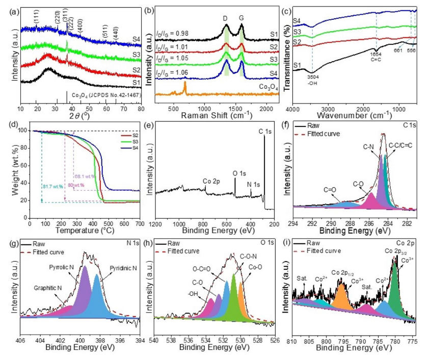 圖2. S1-S4樣品的XRD圖譜(a);Co?O?及S1-S4的拉曼光譜(b);S1-S4的FT-IR光譜(c);S2-S4的TGA曲線(d);S3的XPS譜圖:全譜掃描(e)、C 1s譜(f)、N 1s譜(g)、O 1s譜(h)和Co 2p譜(i)