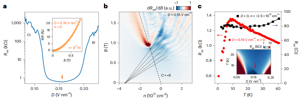 · 100 mK溫度下電荷中性點(n=0)的Rxx隨位移場D變化。在小D(關(guān)聯(lián)絕緣體)和大D(能帶絕緣體)區(qū)域電阻達兆歐級,而在中間D區(qū)驟降至千歐以下。插圖:D=0.16 V·nm?¹、n=0時的磁阻比 [R<sub>xx</sub>(B)−R<sub>xx</sub>(0)]/R<sub>xx</sub>(0) 隨磁場B的變化。橙色數(shù)據(jù)點符合B²依賴關(guān)系,表明補償型半金屬相。