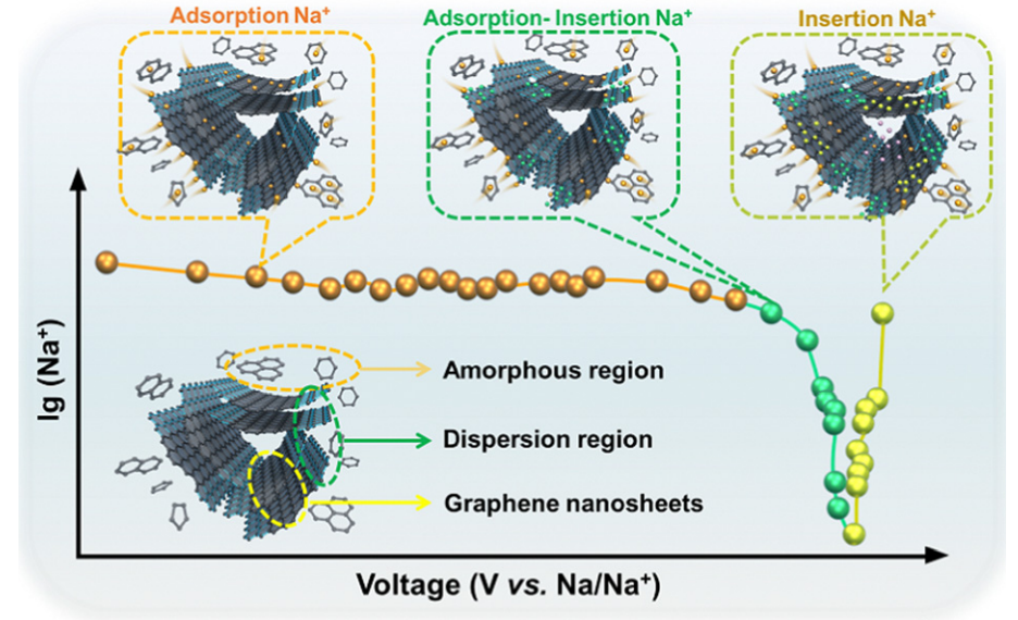 圖1 硬碳三組分(非晶區(qū)、彌散區(qū)、短程有序石墨)與離子擴(kuò)散系數(shù)及儲鈉機(jī)制的對應(yīng)關(guān)系示意圖