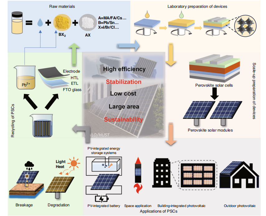 在短短十多年間,經(jīng)認(rèn)證的單結(jié)鈣鈦礦太陽(yáng)能電池(PSCs)的功率轉(zhuǎn)換效率(PCE)已達(dá)到26.1%。這一卓越性能使得鈣鈦礦太陽(yáng)能電池的進(jìn)一步發(fā)展極具潛力。本文詳細(xì)概述了鈣鈦礦太陽(yáng)能電池產(chǎn)業(yè)化過(guò)程中面臨的挑戰(zhàn),并基于廣泛研究提出了相應(yīng)的解決方案。我們討論了該領(lǐng)域的主要挑戰(zhàn),包括技術(shù)局限、多場(chǎng)景應(yīng)用及可持續(xù)發(fā)展等。成熟的光伏解決方案為鈣鈦礦社區(qū)提供了克服產(chǎn)業(yè)化挑戰(zhàn)的寶貴見(jiàn)解。在鈣鈦礦太陽(yáng)能電池的未來(lái)發(fā)展中,解決長(zhǎng)期穩(wěn)定性和可持續(xù)性問(wèn)題至關(guān)重要。通過(guò)這種方式,我們可以促進(jìn)鈣鈦礦太陽(yáng)能電池更有效地融入我們的日常生活。