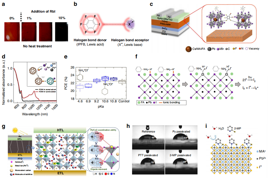 i. 2-MP處理的鈣鈦礦鈍化機(jī)制。經(jīng)威利-VCH出版社許可轉(zhuǎn)載,版權(quán)歸2019年所有(參考文獻(xiàn)58)。