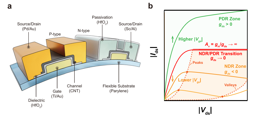 圖1 | CMOS碳納米管薄膜晶體管結(jié)構(gòu)及其門極調(diào)控負(fù)微分電阻(NDR)行為與本征增益奇點(diǎn)示意圖