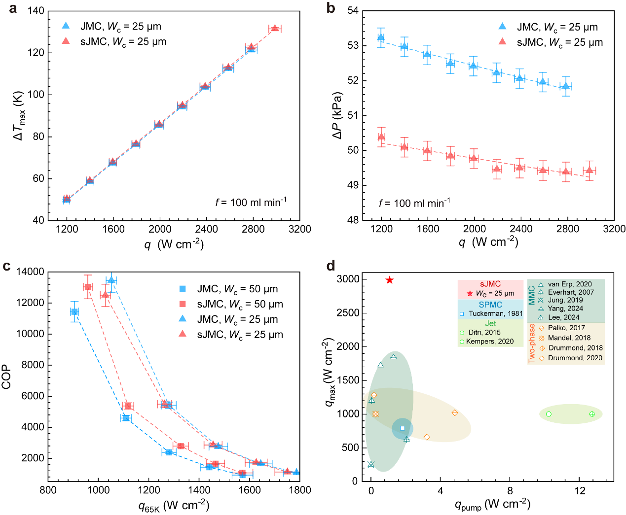 實(shí)驗(yàn)結(jié)果顯示該冷卻技術(shù)性能優(yōu)異:在120毫升每分鐘的流量下,25微米寬通道的芯片熱阻低至0.036Kcm²/W(圖3);鋸齒側(cè)壁顯著降低壓降(例如,50微米寬通道下壓降從76.9kPa降至66.4kPa),并維持或略優(yōu)于直通道的冷卻性能。在極限性能測試中,冷卻超過1000W/cm²的熱流時(shí)該方案性能系數(shù)(COP)高達(dá)13,000,此時(shí)芯片最大溫升僅為65度。在3000W/cm²的極限工況下,芯片最大溫升控制在130度,同時(shí)壓降低于50kPa(圖4)。