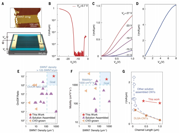 高開關(guān)比和電流密度:實現(xiàn)了接近10?的開關(guān)比和高達6 mA/μm的最大電流密度,這些性能指標優(yōu)于或接近傳統(tǒng)硅基FET和之前報道的SWNT陣列或薄膜FET。