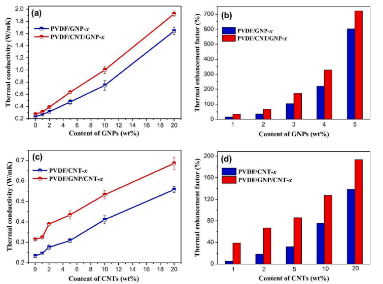 CNTs具有極高的熱導(dǎo)率,這使得它們能夠顯著提高聚合物復(fù)合材料的熱傳導(dǎo)性能。在需要高效散熱的應(yīng)用場(chǎng)景中,如電子設(shè)備封裝和熱管理系統(tǒng),CNTs增強(qiáng)的聚合物復(fù)合材料具有顯著優(yōu)勢(shì)。