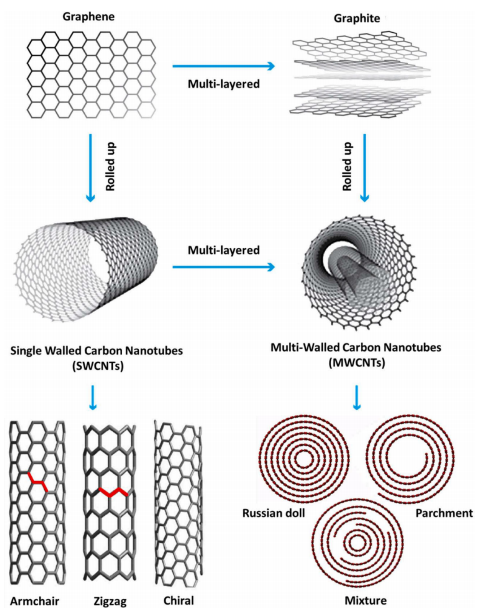 圖2主要展示了單壁碳納米管(sWCNTs)和多壁碳納米管(MWCNTs)的形成過(guò)程,以及這兩種碳納米管的不同構(gòu)型。