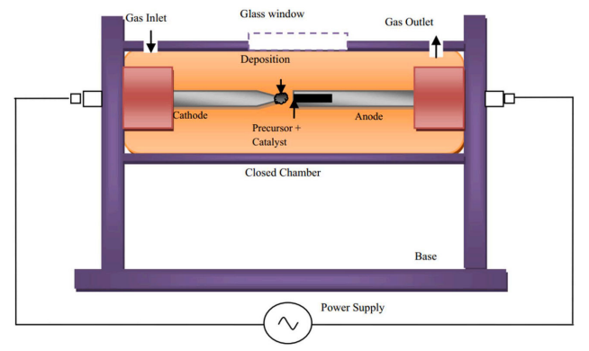 圖3. 電弧放電法/等離子電弧放電法制備碳納米管(CNT)的裝置示意圖。經(jīng)參考文獻(xiàn)[相關(guān)文獻(xiàn)]許可采用。