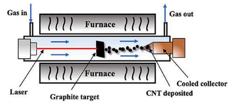 圖4展示了激光蒸發(fā)(或稱為激光燒蝕)方法制備碳納米管(CNTs)的示意圖。激光蒸發(fā)/燒蝕法是一種利用高能激光束照射石墨靶材,使其表面材料瞬間蒸發(fā)并形成碳納米管的技術(shù)。