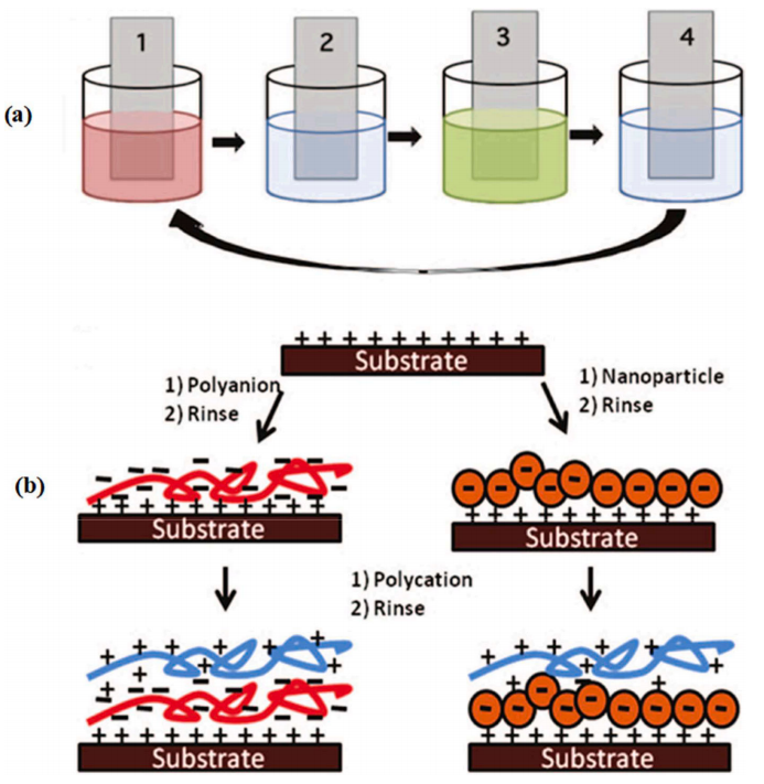 圖6. (a) 層層自組裝(LBL)薄膜沉積的示意圖。步驟1和步驟3展示了聚陰離子和聚陽(yáng)離子的吸附過(guò)程,步驟2和步驟4代表洗滌步驟。(b) 兩種吸附路徑,即聚合物以及聚合物與納米粒子的LBL沉積。經(jīng)參考文獻(xiàn)許可采用。