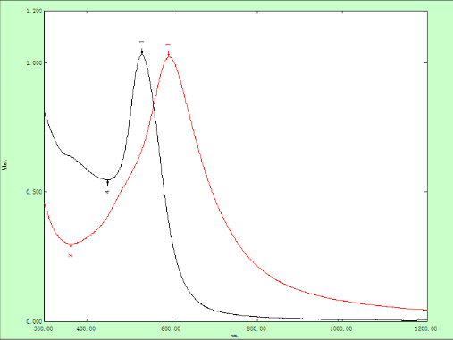 圖示: 檸檬酸鈉穩(wěn)定的金納米殼(紅色譜線,峰位置:592 nm)和檸檬酸鈉穩(wěn)定的金納米球(40 nm,峰位置:530)光譜的對比圖